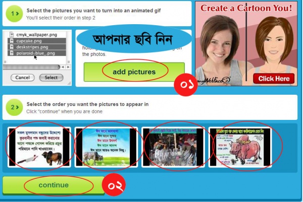 এখন add pictures এ ক্লিক করুন , যে ছবি গুলো দিয়ে GIF বানাতে চান সেগুলো সিলেক্ট করুন। আমি চারটি নিয়েছি আপনিও নিতে পারেন আমার মত করে।