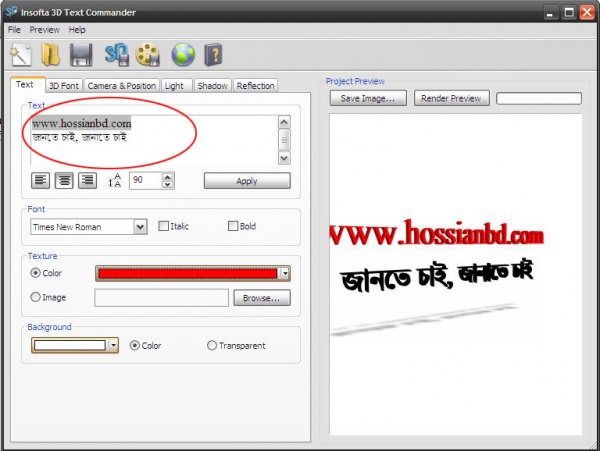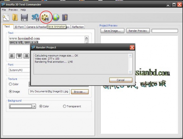 সেভ হতে একটু সময় নিবে ততক্ষণ পর্যন্ত অপেক্ষা করুণ। এভাবে Camera & Position,, Light, Shadow ও Refection বাটনে ক্লিক করে আপনার 3D লেখাকে আরো সুন্দর ভাবে ফুটিয়ে তুলতে পারবেন।
