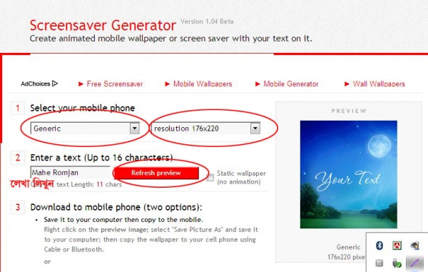 এবার Select your mobile phone থেকে আপনার মোবাইলের মডেলটি থাকলে সিলেক্ট করুন। না থাকলে আপনার মোবাইলের রেজুলেশন অনুসারে এনিমেশনের রেজুলেশন সিলেক্ট করুন। তারপর Enter A Text(up to 16 characters) এর জায়গায় আপনার পছন্দের নামটি টাইপ করুন এবং সবশেষ Refresh Preview বাটনে ক্লিক করুন।
