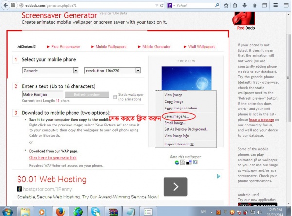 এবার ডানপাশে দেখুন আপনার নাম দিয়ে এনিমেশন তৈরি হয়ে গেছে। এবার এনিমেশনটি সেভ করতে ছবির উপর রাইট বাটনে ক্লিক করে সেভ করে রাখুন।