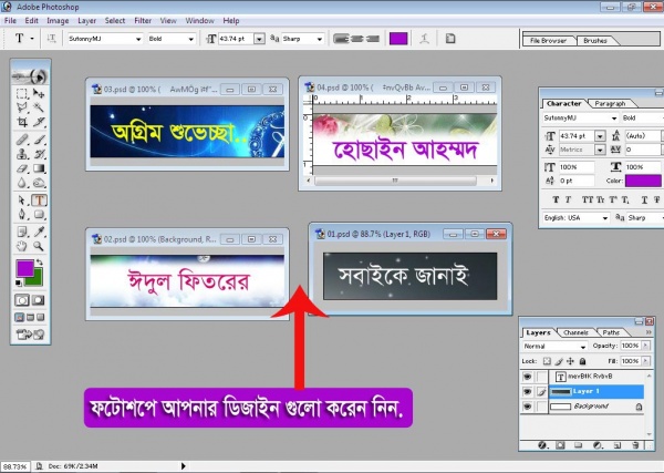 তার আগে আপনি ফটোশপে ভাল জানা থাকলে আমার মত ৪টি ডিজাইন তৈরি করে রাখুন পরবর্তী আমাদের এই ছবি গুলো এনিমেশন তৈরি তে কাজে দিবে।
