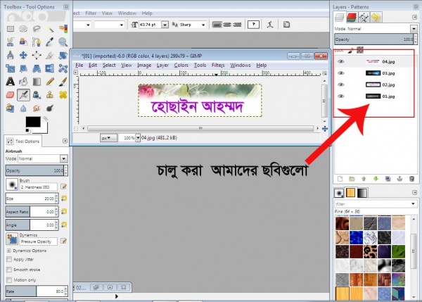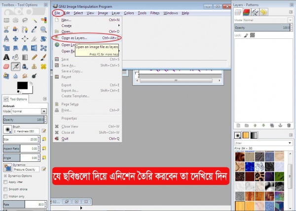 এবার File>Open as Layers বাটনে ক্লিক করে আপনার ছবিগুলো দেখিয়ে দিন উপরের মত করে । তাহলে আমাদের ছবি গুলো লেয়ার এর মধ্যে শো করবে।