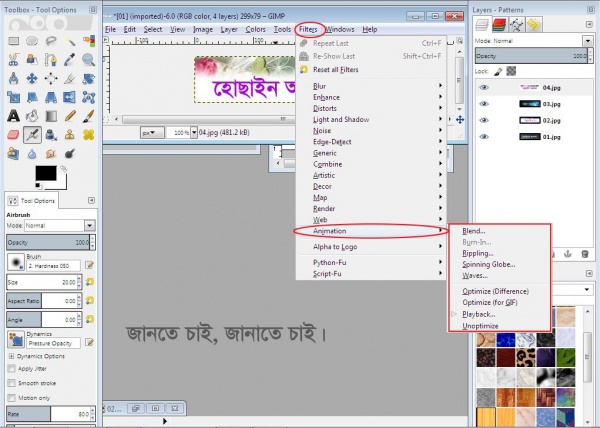 এবার আমাদের এনিমেশন তৈরি করার পালা এনিমেশন তৈরি করতে Filters> Animationএ ক্লিক করুন ।