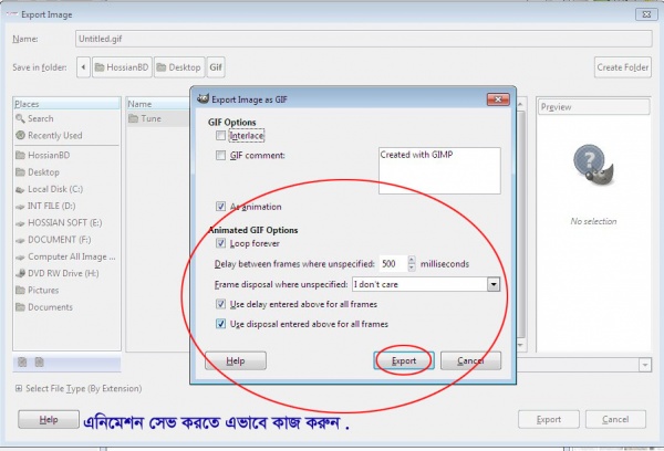 সবশেষ Save করতে হলে File> Export As বাটনে ক্লিক করুন- তাহলে নিচের মত ১টি ডায়ালগ বক্স আসবে, নিচের মান দিয়ে Export বাটনে ক্লিক করুন । ১টি জিনিস ভাল করে খেয়াল রাখতে হবে যে এখানে Delay between frames where unsecified বক্স এ সাধারণত মান 20 দেওয়া থাকে যদি মান 20 থাকে আপনি 500 করে দিন না হলে কিন্তু এনিমেশন হবে কিন্তু খুব দ্রুত হবে।