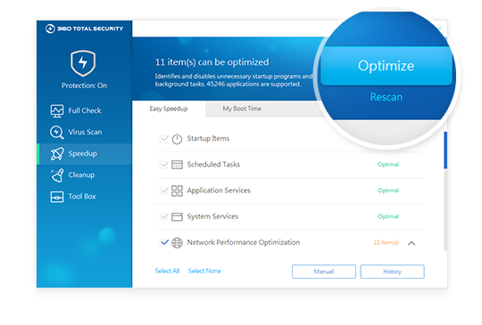 এন্টিভাইরাস ছাড়াও 360 Total Security - এর রয়েছে Inbuilt স্পিডআপ ইন্টারফেস । যার সাহায্যে আপনি সহজেই আপনার পিসির Start up Items, Application services, Network speed কে অপ্টিমাইজ করে নিতে পারবেন মাত্র কয়েক ক্লিকে ।