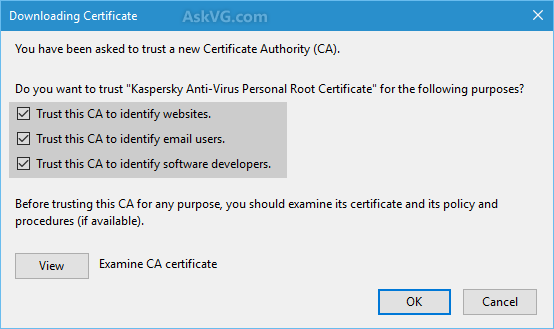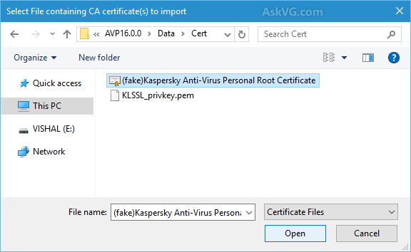 আপনি চাইলে মেনুয়ালিও ফাইলটিকে দেখিয়ে দিতে পারবেন। এর নিচের চিত্রের মত একটি বক্স আসবে সেখান থেকে (fake)Kaspersky Anti-Virus Personal Root Certificate.cer ফাইলটি দেখিয়ে দিন।