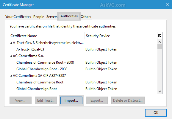 উপরের চিত্রের মত বক্স আসলে View Certificates বাটনে ক্লিক করুন এর একটি পপ আপ Certificate Manager বক্স আসবে। সেখান থেকে Authorities ট্যাপে ক্লিক করুন। এর পরে Import ট্যাপে ক্লিক করুন। নিচের চিত্রের মত।