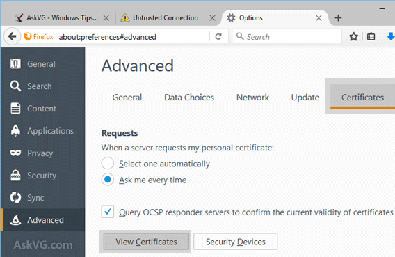 ফায়ারফক্স এর মেনু অপশন থেকে Preferences ক্লিক করুন। সেখান থেকে ক্লিক করুন Advanced বাটনে। এখন ক্লিক করুন Certificates ট্যাপে। নিচের চিত্রের মত।