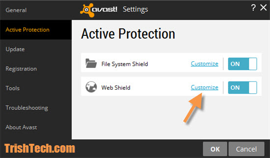 Settings উইনডো আসলে সেখান থেকে Active Protection ক্লিক করুন। ক্লিক করলেই দেখতে পাবেন। Web Shield সেখান কার Customize এ ক্লিক করুন। নিচের চিত্রে মত করে।