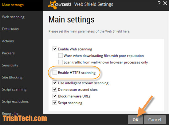 Customize এ ক্লিক করলে নিচের মত একটি পপ আপ বক্স আসবে সেখানে Enable HTTPS Scanning অপশনটির চেক বক্স থেকে টিক চিহ্নটি উঠে দিন। নিচের চিত্রের মত।
