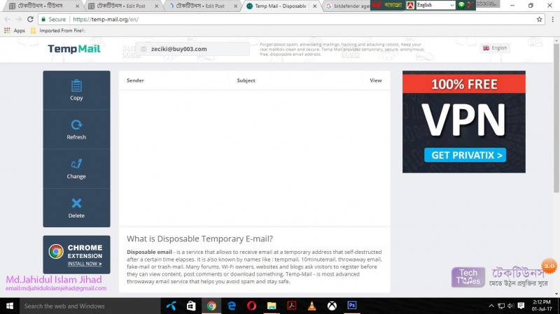 এবার কম্পিউটার নরমাললি র্স্টাট নিবে।ব্যস কাজ প্রায় শেষ। Bitdefender antivirus আপনার নিয়ন্ত্রণে এসে গেছে।এবার আপনি কোনো একটা টেম্পরারী সাইটে যান এবং একটা টেম্পরারী মেইল নেন।যেমন আমি https://temp-mail.org/en/ সাইট থেকে একটা মেইল নিলাম।