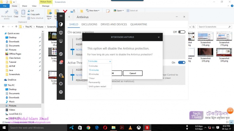নতুন একটা মেনু আসবে সেখানে On access scanning অন করা দেখতে পারবেন আপনাকে সেটা অফ করতে হবে।কত সময়ের প্রেটেকশন বন্ধ করতে চান এরকম একটা উইন্ডো আসবে।১৫ মিনিট সিলেক্ট করে ওকে দিন।
