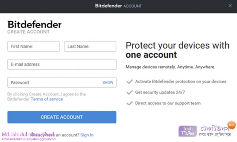 এবার বিটডিফেন্ডার এজেন্ট চালু করে এই টেম্পরারি মেইল দিয়ে আগের নাম পাসওর্য়াড দিয়ে নতুন করে একাউন্ট খুলুন।