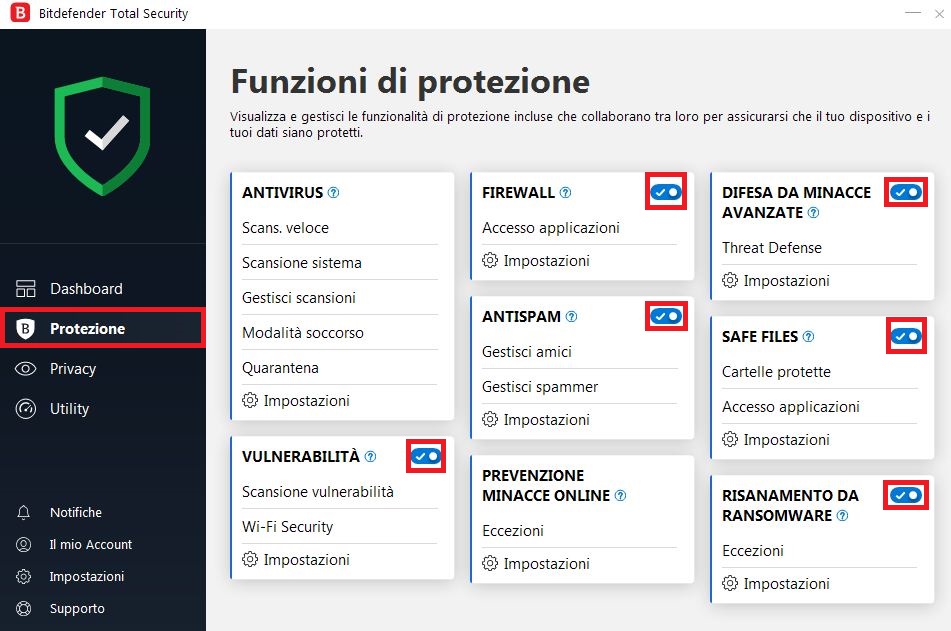 Bitdefender অ্যান্টিভাইরাস প্রধান ইন্টারফেস ক্লিক করুন: কার্যকারিতা দেখুন এবং সমস্ত অ্যান্টিভাইরাস প্রতিবন্ধক অক্ষম।
