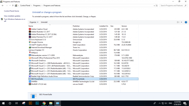5. এবার আপনার ইনষ্টলকৃত সফটয়্যারটি খুঁজে বের করুন। খুঁজে বের করার ক্ষেত্রে অপরিচিত সফটয়্যারকে বেশি গুরুত্ব দিন যেমন আমার এখানে একটি অপরিচিত উৎস থেকে ডাউনলোড করে ইনষ্টল করা একটি সফটয়্যার পেয়েছি যেটির নাম SEO PowerSuite এটির কারনেই আসলে আমার অ্যাড গুলা আসছে। এটি আমি আনইনষ্টল করছি।