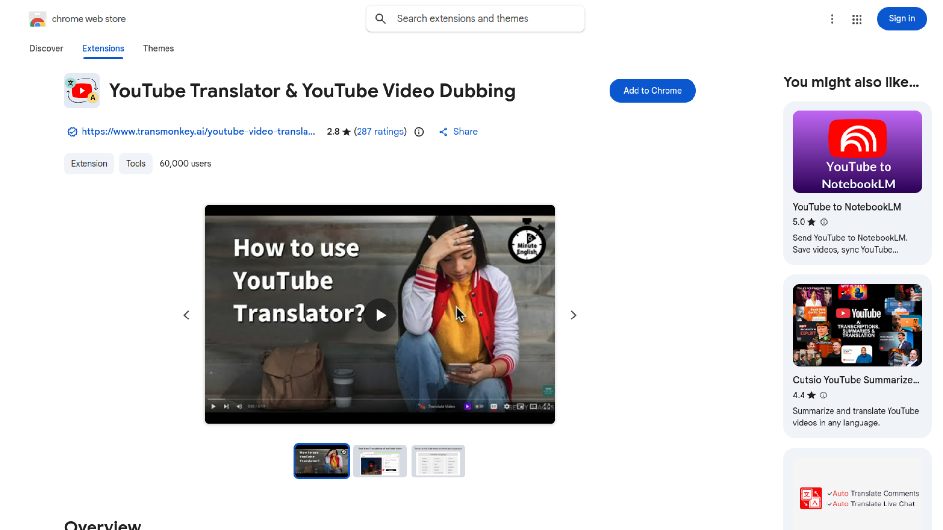 ১. Extension ইন্সটল করুন (Install the Extension): প্রথম Step হল "YouTube Translator" Chrome Extension টি Download এবং Install করা। এর জন্য Chrome Web Store-এ যান, "YouTube Translator" লিখে Search করুন এবং Extension টি খুঁজে বের করুন। Chrome Web Store এ Extension টি খুঁজে পাওয়ার পরে "Add to Chrome" Button এ ক্লিক করে Browser এ Download করুন। Download হয়ে গেলে Extension টি স্বয়ংক্রিয়ভাবে Install হয়ে যাবে। Install হওয়ার পরে আপনি Tool বার এ Extension টির Icon দেখতে পাবেন।