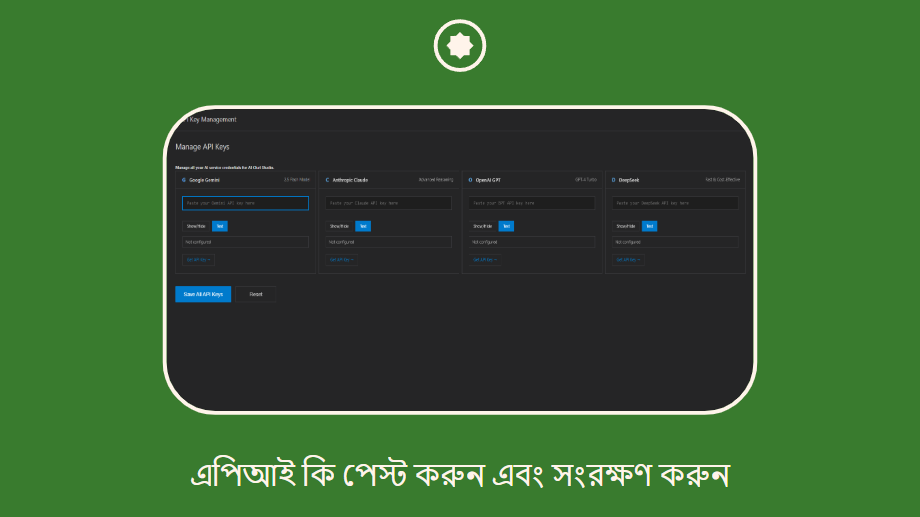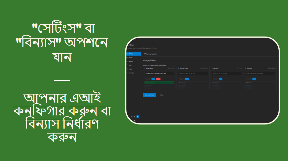 API Key সেট করা: প্রথমে "Settings" পেজে যাও। সেখানে তোমার নিজের একটি API Key (যা Google AI Studio থেকে পাবে) বসিয়ে সেভ করো।