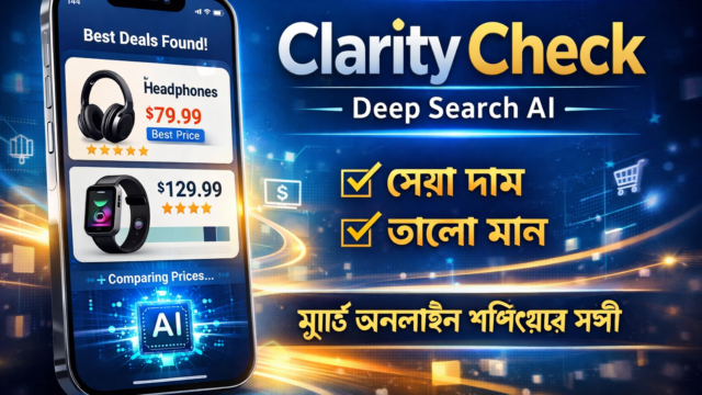 বর্তমান সময়ে অনলাইন শপিং আমাদের দৈনন্দিন জীবনের একটি গুরুত্বপূর্ণ অংশ হয়ে উঠেছে। আমরা পোশাক, ইলেকট্রনিক্স, গ্যাজেট, কসমেটিকস থেকে শুরু করে প্রায় সবকিছুই অনলাইনে কিনে থাকি। তবে একটি বড় সমস্যা হলো—কোন ওয়েবসাইটে একই পণ্যের দাম কম? আর কোন পণ্যের মান ভালো? অনেক সময় একাধিক সাইট ঘুরে ঘুরে দাম, রিভিউ ও রেটিং তুলনা করতে গিয়ে সময় নষ্ট হয়। এই সমস্যার সহজ সমাধান নিয়ে এসেছে Clarity Check – Deep Search AI।