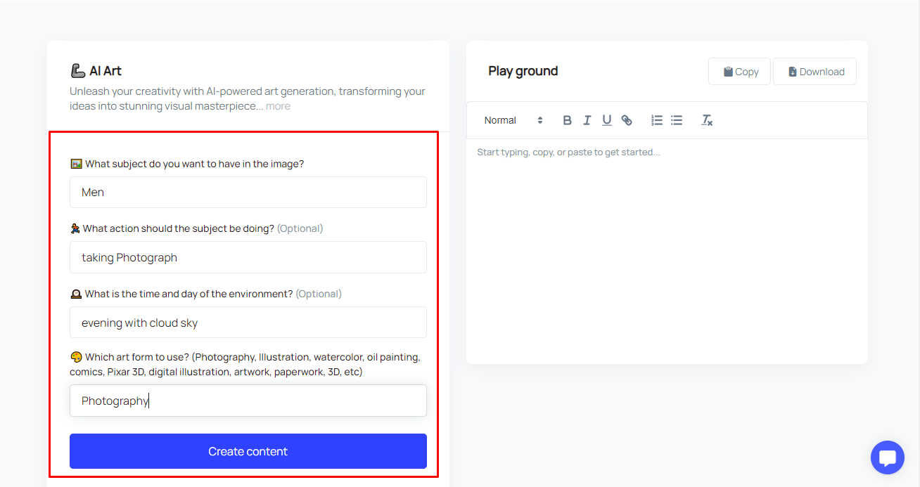 চারটি বক্স পাবেন, ইমেজ ধারণা দেয়ার জন্য। প্রথম বক্সে ইমেজটি কিসের হবে, সেটা ঠিক করুন। দ্বিতীয় বক্সে সিলেক্ট করুন আপনার সাবজেক্ট কি করতে থাকবে। তৃতীয় বক্সে চারপাশের পরিবেশ কী হবে সেটা লিখুন। চতুর্থ বা শেষ বক্সে ঠিক করুন আপনার ছবি কোন ফর্মের আর্ট হবে। আপনি Photography, Illustration, watercolor, oil painting, comics, সিলেক্ট করতে পারেন।