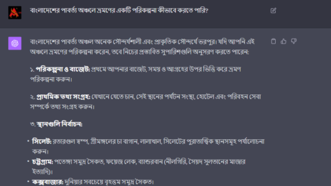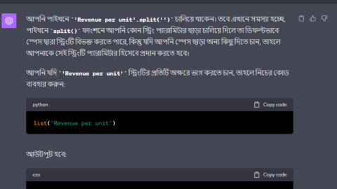 - ট্রাবলশুট (Troubleshoot): বিভিন্ন ডেটা আন্যালাইস সফট্ওয়্যার যেমন এক্সল, এক্সস, পাইথন ইত্যাদির সূত্র বা গণনায় কোন ভুল নির্ণয় করতে চ্যাটজিপিটির ‘Troubleshoot’ কমান্ড ব্যবহার করা হয়।
