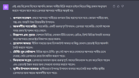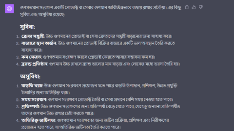পূর্বের উদাহরণে ক্রেতাকে কীরূপে পণ্যের প্রতি আকৃষ্ট করা যায় এরূপ প্রশ্নে চ্যাটজিপিটি যে রেসপন্স তৈরি করেছে তার মধ্য হতে ‘গুণগতমান সংরক্ষণ’ এর সুবিধা ও অসুবিধা জানতে চাইলে, চ্যাটজিপিটি নিম্নোক্ত রেসপন্স প্রদান করে: