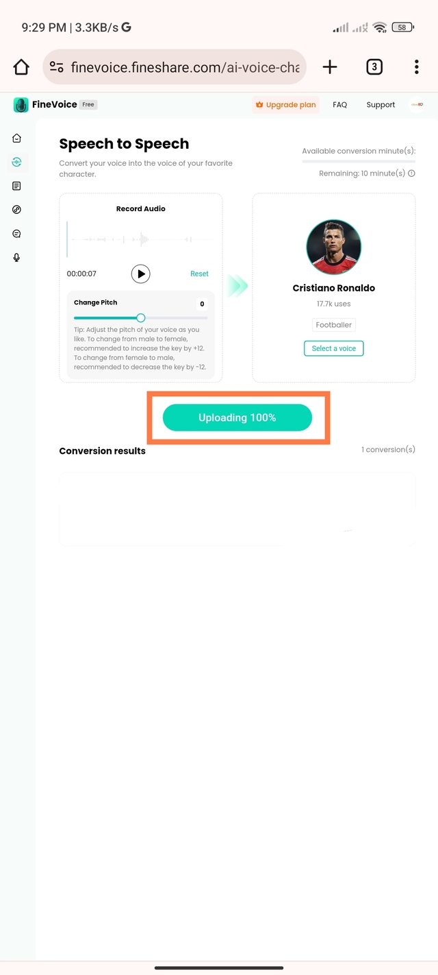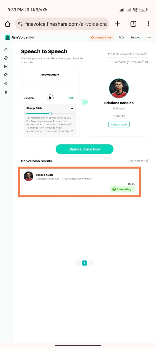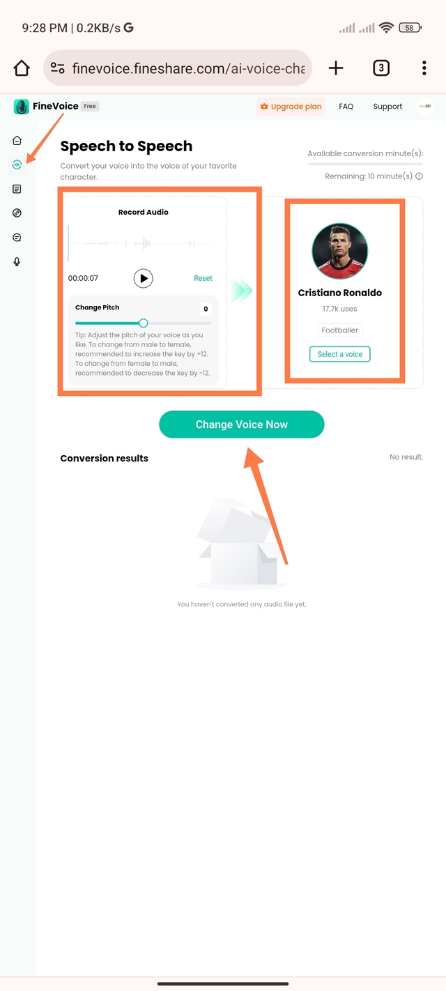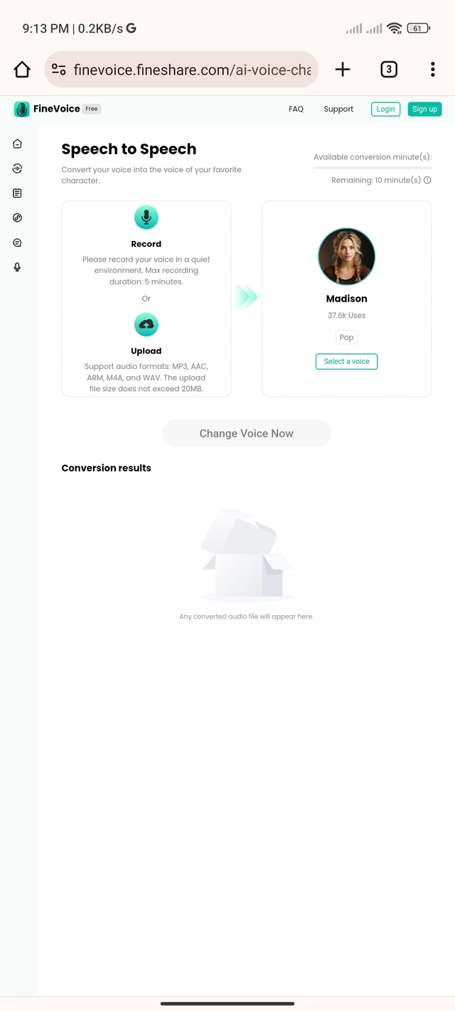 ১০. সবকিছু ঠিকভাবে করা হলে আপনাদের সামনে ভয়েজ চেঞ্জ করার জন Fineshare Ai ওয়েবসাইটের মূল ভয়েস চেঞ্জ পেজটি আপনাদের সামনে চলে আসবে। এখানে আপনি মোট ২ ভাবে আপনার ভয়েস মেল থেকে ফিমেল ভয়েসে কনভার্ট করতে পারবেন।