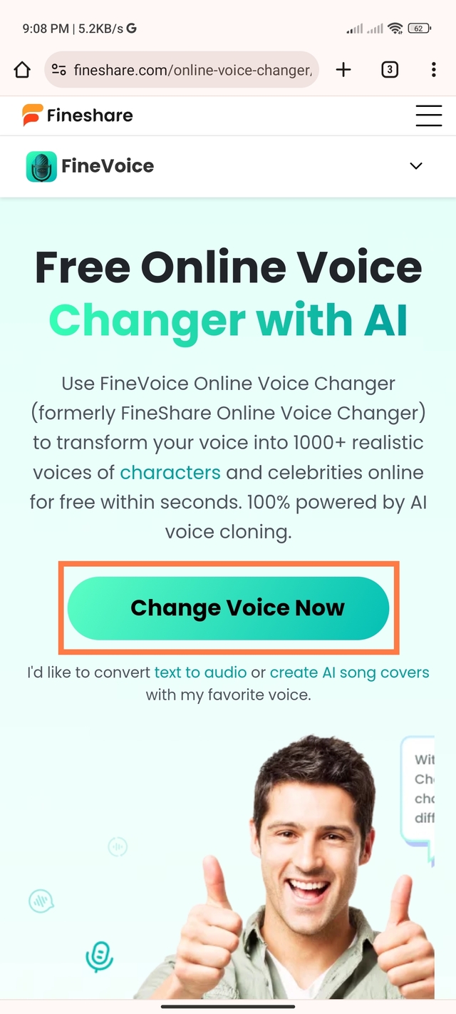 ২. ওয়েবসাইটে ভিজিট করার পর, এখানে আপনার ভয়েস চেঞ্জ করার জন্য Change Voice Now অপশনে ক্লিক করবেন। এছাড়াও আপনি এখানে আগে রেকর্ড করা ভয়েস আপলোড করেও ভয়েস মেল থেকে ফিমেলে কিংবা ফিমেল থেকে মেলে কনভার্ট করে নিতে পারবেন।