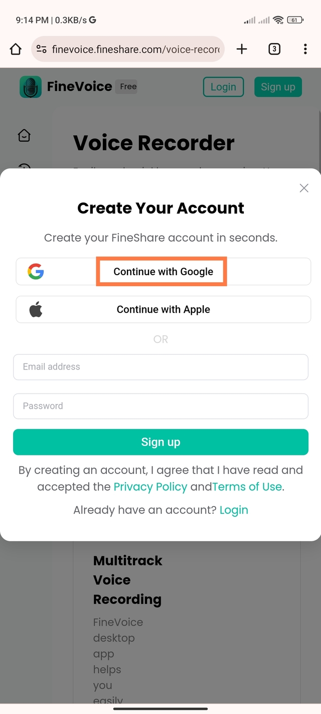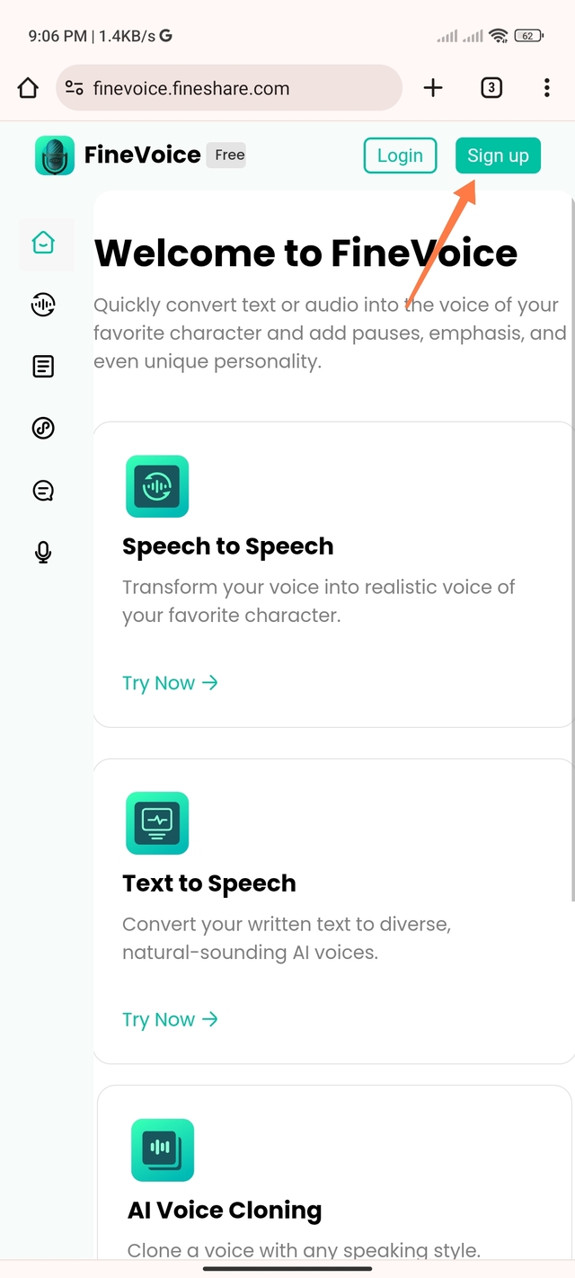 ১. কাজটি করার জন্য সর্বপ্রথম আপনারা এই Fineshare Ai ওয়েবসাইটটিতে প্রবেশ করবেন। ওয়েবসাইট লিংক আমি একদম শেষে দিয়ে দিবো। ওয়েবসাইটে প্রবেশ করার পর অনলাইনে ভয়েস চেঞ্জ করার জন্য আপনার এখানে একটি অ্যাকাউন্ট করার প্রয়োজন হবে। আপনি এই Fineshare Ai অ্যাকাউন্ট না করলে এখানে আপনি আপনার ভয়েস চেঞ্জ করতে পারবেন না। তাই অনলাইনে কাজগুলো করার জন্য অবশ্যই আপনাকে Fineshare Ai একটি ফ্রি অ্যাকাউন্ট করে নিতে হবে।