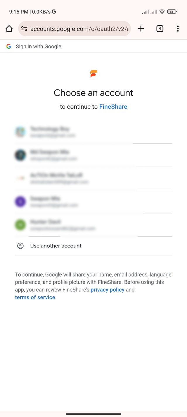 ৬. তারপর আপনারা যে জিমেইল অ্যাকাউন্টটি দিয়ে এই Fineshare Ai ওয়েবসাইটে অ্যাকাউন্ট করতে চান সেই জিমেইল টিতে ক্লিক করে সেই মেইলটি সিলেক্ট করে দিন।