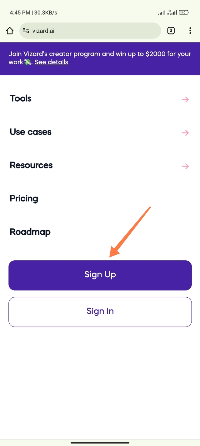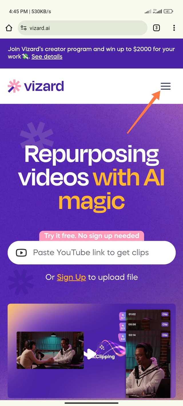 ১. কাজটি করার জন্য আপনি সর্বপ্রথম Vizard Ai এর অফিসিয়াল ওয়েবসাইটে প্রবেশ করুন। ওয়েবসাইটের লিঙ্ক আমি টিউনের শেষে দিয়ে দেবো আপনারা সেখানে ক্লিক করে ওয়েবসাইটটিতে ভিজিট করবেন।