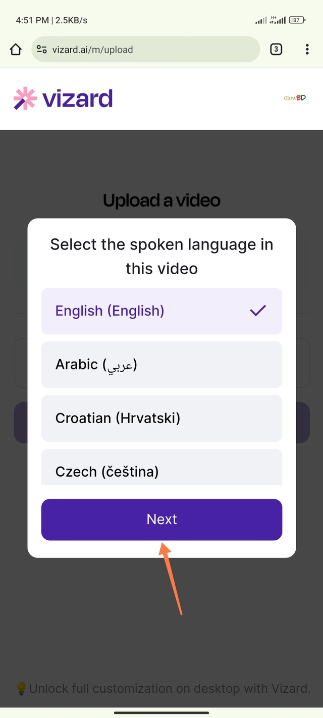 ৬. এবার একটু লোডিং হবে, আপনারা অপেক্ষা করুন। তারপর আপনারা Select Language অপশনে ক্লিক করে আপনাদের পছন্দমতো একটি ভাষা যুক্ত করে দিন। তারপর আপনি কতক্ষণ পর পর শর্ট ভিডিও বানাতে চান সেটিও আপনার ইচ্ছামতো সেট করে দিন। সবকিছু সেট করা হয়ে গেলে নীচ থেকে Next অপশনে ক্লিক করুন।