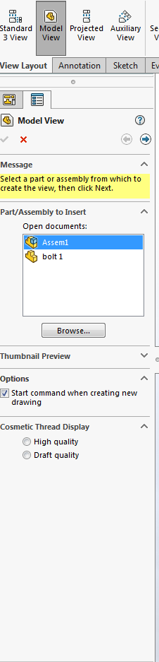 আপনার এসেম্বলি ড্রয়িং শুরুর ক্ষেত্রে এটি একটি কিক অফ স্টার্ট টুল। আপনি যেই প্লেন আর অরিজিনের সাপেক্ষে আপনার ডিজাইন ও ওয়ার্কপিস আঁকেন, সলিডওয়ার্কস ৩ টি ভিউ বেছে নিবে যাতে আপনি ডাইমেনশন, টলারেন্স এবং নোটস যোগ করতে পারবেন। সলিডওয়ার্কস স্বতঃস্ফুর্তভাবে আপনাকে যে দিকগুলো প্রদান করবে, তা হল superior, front এবং right view ঠিক যেমন নিচের ছবিতে দেখানো হয়েছে।