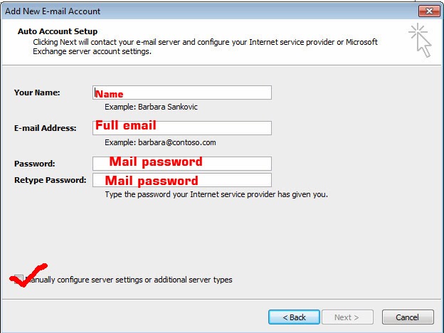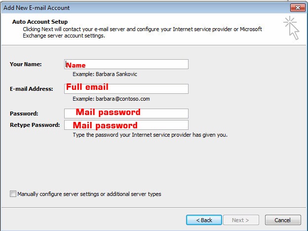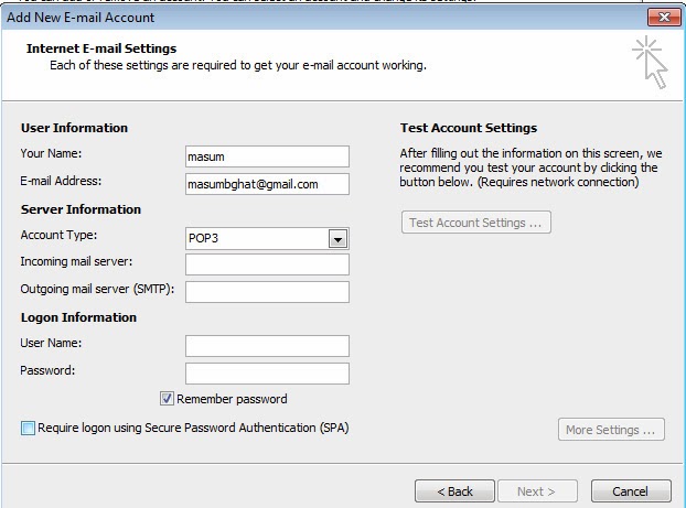 প্রয়েজনীয় তথ্য গুলো দিন। ইনকামিং আউটগোইং সাভার নেম উপরের চার্টে আছে আপনার মেইল অনযায়ী দেখে নিন।
