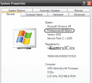 আপনারটি চেক করার জন্য My Computer>Properties>General এ যান যাকে আমরা My Computer Properties বা System Properties বলে থাকি। ওখানে আপনি দেখবেন আপনি কোন অপারেটিং সিস্টেম ব্যবহার করেন, কত ভার্সন এবং তা কত বিটের। আপনর পিসি কত র্যাম ব্যবহার করছে তাও ওখানে দেখতে পাবেন। যদি বিট দেখতে না পান তাহলে বুঝে নেবেন আপনি ৩২বিটই ব্যবহার করছেন। ৬৪ হলে তা অবশ্যই প্রদর্শিত হবে। কিন্তু ৩২বিট হলে তা ভার্সনভেধে প্রদর্শিত নাও হতে পারে।