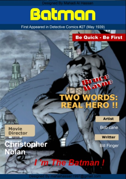 ব্যাটমান আমার খুব প্রিয় সুপারহিরো! তাই ব্যাটমানকে নিয়ে আমি একটা কভার বানালাম। এতে অবশ্য বেশ সময় দিতে হয়েছে। আগামীতে বস Bear Grylls কে নিয়েও একটা কভার বানাব।