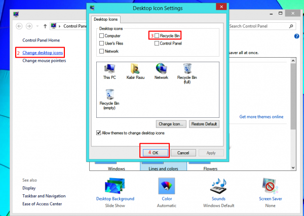 Recycle Bin সমস্যার সমাধান: রিসাইকেল বিন হাইড করতে ডেস্কটপের খালি জায়গায় মাউসের Right Button (Ctrl+Click For single button mouse) ক্লিক করুন। Personalize › Change Desktop icon› Than Uncheck Recycle Bin.