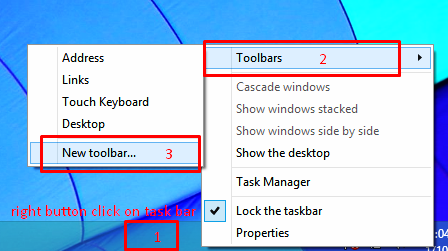 এবার Task bar এ Right button ক্লিক করে Toolbar এ গিয়ে New Toolbar Select করুন।