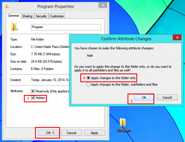 এবার ডেস্কটপ থেকে ফোল্ডারটি Hide করে দিন। হা্ইড করতে ফোল্ডারের উপর রাইট বাটন ক্লিক করে Properties এ যান। তারপর নিচের ছবি অনুসরণ করুন।