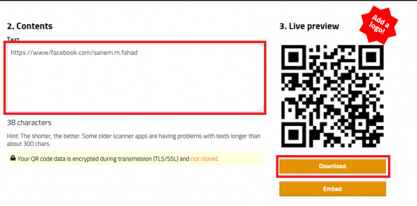 দ্বিতীয় পদ্ধতি হলো এখান থেকে QR Code Image Generator ওয়েব সাইটে প্রবেশ করুন। তারপর চিত্রে দেখানো নির্দেশনা অনুসরন করুন। এই পদ্ধতিটি সার্বজনিন। যেকোন ব্রাউজারের সাহায্যে আপনি কাজটি করতে পারবেন।