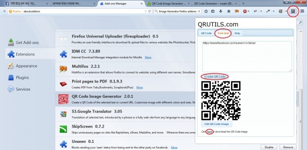 QR code তৈরী করার জন্য আপনি ২টা পদ্ধতি বেছে নিতে পারেন। প্রথমে পদ্ধতি হলো এখান থেকে মজিলা ফায়ারফক্স এর জন্য QR Code Image Generator এডনটি ডাউনলোড করে নিন। তারপর নিচের চিত্রে দেখানো জায়গায় ক্লিক করুন এবং বক্সে আপনি যে টেক্সটটি থেকে QR code তৈরী করবেন সেটা লিখুন। তারপর Create QR Code অপশনে ক্লিক করুন। দেখবেন আপনার QR Code টি তৈরী হয়ে গিয়েছে। এখন শুধু ইমেজটা ডাউনলোড করুন।