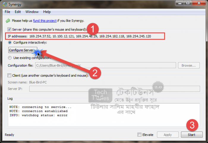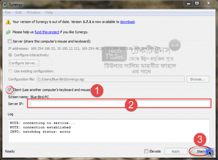 সার্ভার যদি প্রস্তত হয়ে থাকে তাহলে এবার ক্লায়েন্ট কনফিগারেশনের পালা। যে কম্পিউটারগুলোর মনিটর কন্ট্রোল করতে চান সেগুলোতে নিশ্চয় Synergy ইনস্টল করে রেখেছেন? এবার চলুন নিচের ধাপগুলো অনুসরণ করা যাক।
