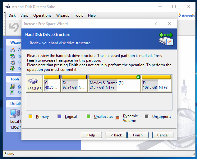 এখানে আপনাকে দেখানো হচ্ছে যে জায়গা বাড়ানোর পর আপনার ড্রাইভগুলোর জায়গার পরিমান কতটুকু হবে। এবার Finish এ ক্লিক করুন।