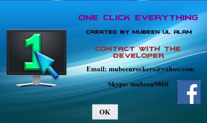 সফটওয়্যারে কোন বাগ/ত্রুটি পেলে, সফটওয়্যারের ব্যাপারে কোন সাজেশন থাকলে প্লীজ আমাকে জানাবেন। এটি আমি একা তৈরী করেছি। এতো বড় একটি সফটওয়্যার একা তৈরী করা অনেক কঠিন এবং সময় সাপেক্ষ ব্যাপার। তবুও আমি আমার সর্বোচ্চ চেষ্টা করেছি কম্পিউটারের প্রয়োজনীয় একটি সফটওয়্যার বানাতে। “ওয়ান ক্লিক এভরিথিং” সফটওয়্যার ব্যবহার করে কেমন লাগল আমাকে জানাবেন প্লীজ।