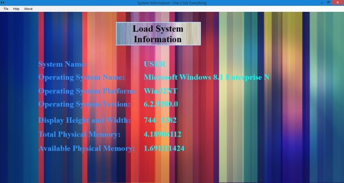 ৫. সিস্টেম ইনফরমেশনঃ আপনার কম্পিউটারের সব দরকারী ইনফরমেশন এর মাধ্যমে দেখতে পারবেন। লোড সিস্টেম ইনফরমেশন এর উপর ক্লিক করলে আপনার কম্পিউটেরের ইনফরমেশন দেখাবে। এখানে ফিজিকাল মেমরি বলতে র্যাম বুঝাচ্ছে। ডিস্প্লে হাইট এবং উইডথ পিক্সেলে দেখাবে।