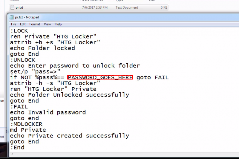 cls @ECHO OFF title Folder Private if EXIST "HTG Locker" goto UNLOCK if NOT EXIST Private goto MDLOCKER :CONFIRM echo Are you sure you want to lock the folder(Y/N) set/p "cho=>" if %cho%==Y goto LOCK if %cho%==y goto LOCK if %cho%==n goto END if %cho%==N goto END echo Invalid choice. goto CONFIRM :LOCK ren Private "HTG Locker" attrib +h +s "HTG Locker" echo Folder locked goto End :UNLOCK echo Enter password to unlock folder set/p "pass=>" if NOT %pass%== asif goto FAIL attrib -h -s "HTG Locker" ren "HTG Locker" Private echo Folder Unlocked successfully goto End :FAIL echo Invalid password goto end :MDLOCKER md Private echo Private created successfully goto End :End