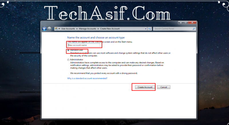 একটা নাম দেন আর standard user টিক দেন। এর পর create account এ ক্লিক করুন