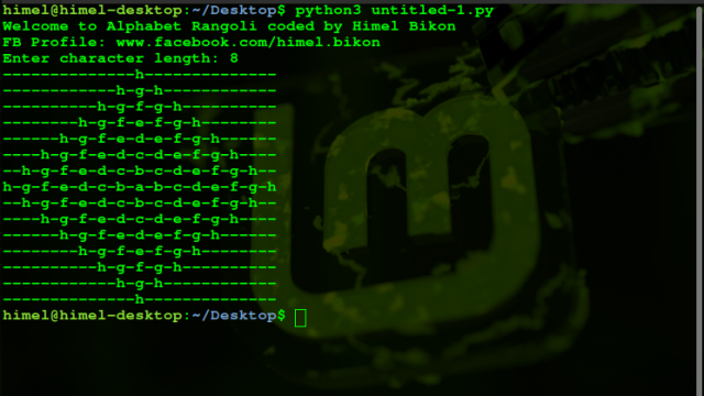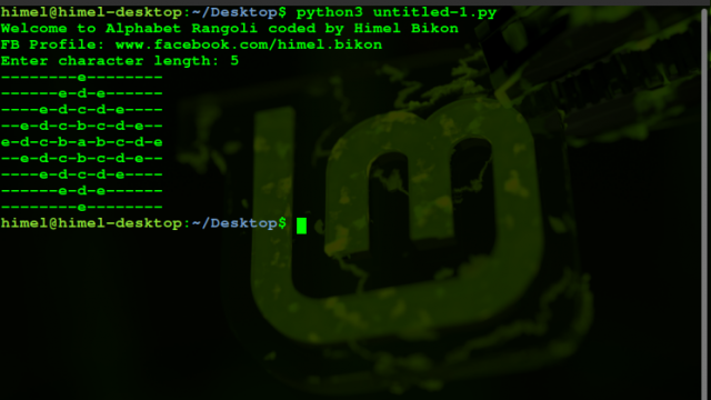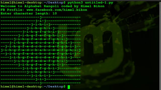 আমি আজ যে প্রোগামটি আপনাদের দেখাব তা ইউজারের দেওয়া দৈর্ঘ্য অনুযায়ী Alphabet Rangoli প্রিন্ট করে দেখাবে। এটি মূলত HackerRank এর একটি কোডিং চ্যালেঞ্জ যা আমি কমপ্লিট করেছি। প্রোগ্রামটি সহজ হলেও প্রথম অবস্থায় মাথায় না ও আশাকরি।
