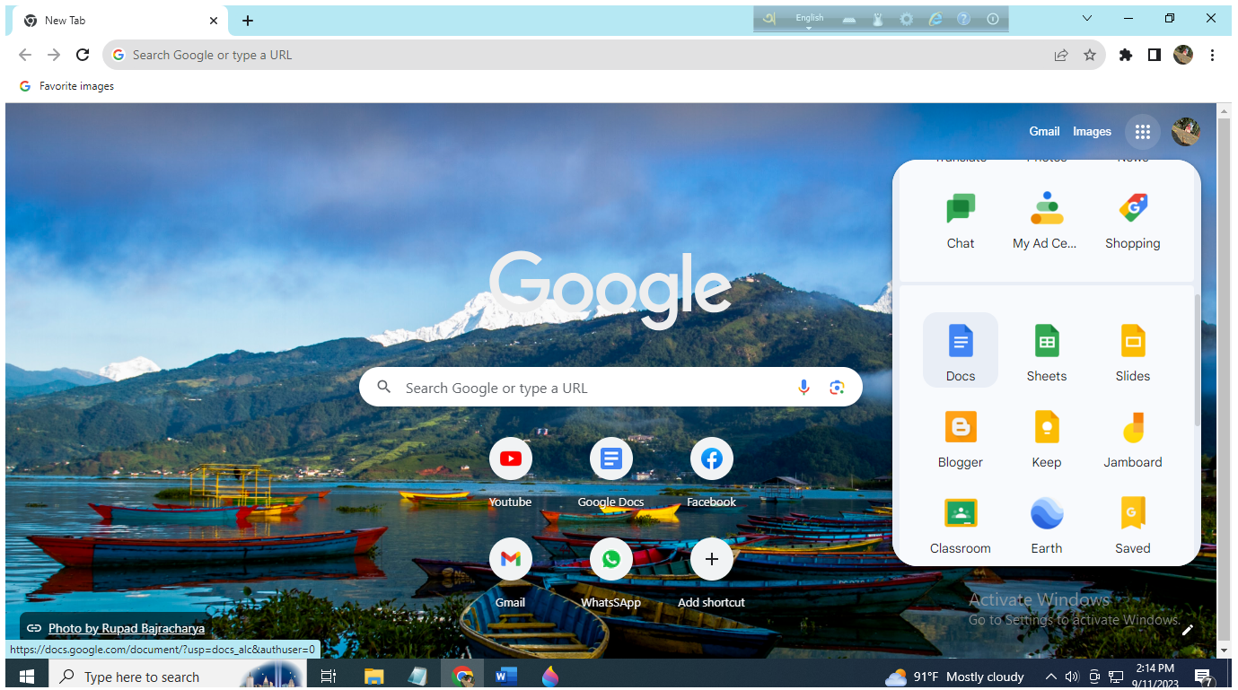 ১. আপনাদেরকে সরাসরি চলে যেতে হবে আপনার কম্পিউটারের গুগল ক্রোম ব্রাউজারে। google chrome ব্রাউজার এ আপনার ইমেইল লগইন করে নিতে হবে। মোবাইলে আসার পর উপরে দেখতে পারবেন কতগুলো অপশন আছে। জিমেইল ইমেজ আপনার প্রোফাইল এবং একটি চারকোনা বক্স আকারের অপশন। সেই অপশনটিতে ক্লিক করতে হবে। অপশনটিতে ক্লিক করার পরেই দেখতে পারবেন গুগল ডক্স নামের একটি অ্যাপ আছে। অথবা আপনি গুগলের সরাসরি গিয়ে সার্চ বারে লিখেন গুগল ডক্স। তাহলে আপনার সামনে এই ওয়েবসাইটটি চলে আসবে। আপনি দুই ভাবে প্রবেশ করতে পারবেন।