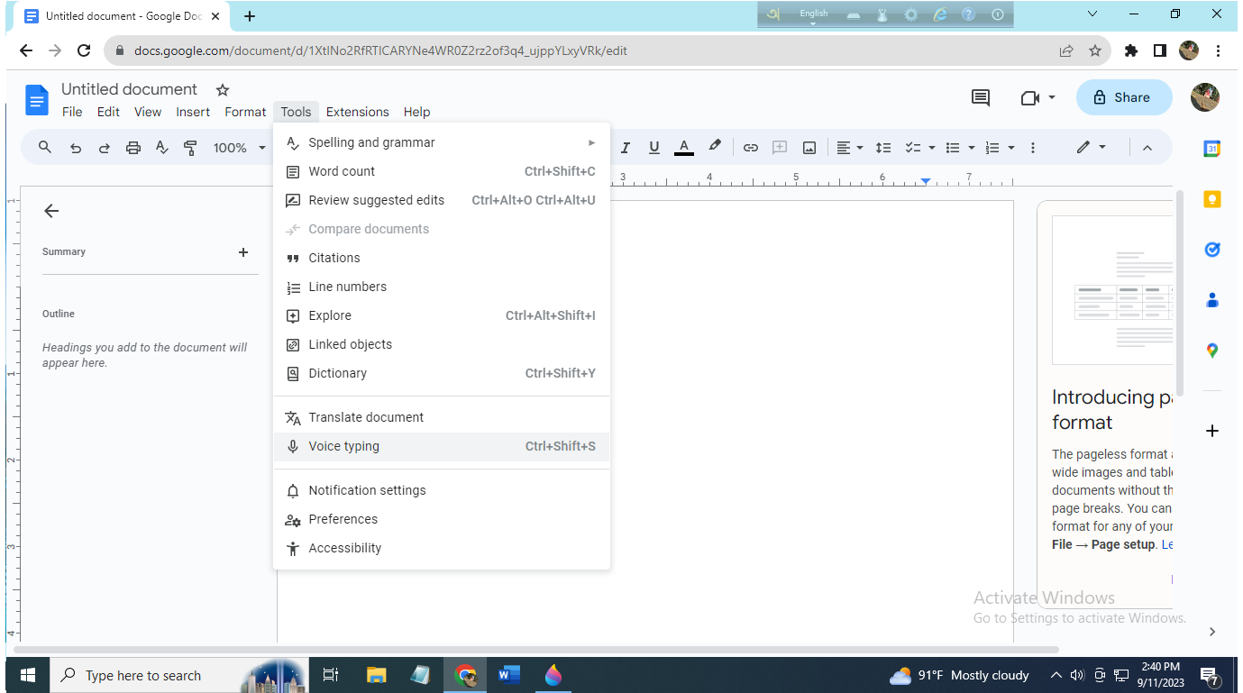 ৩. ক্লিক করার পর আপনাদের সামনে একটি সাদা পৃষ্ঠায় চলে আসবে। এখানে আপনাকে টাইপ করতে হবে। টাইপ করার আগে আপনাকে অবশ্যই কম্পিউটারের সাথে একটি মাইক্রোফোন সংযোগ করতে হবে। মাইক্রোফোনের কোড সাধারণত কম্পিউটারের পেছনে অথবা সামনে থাকতে পারে। মাইক্রোফোন কে কানেক্ট করা হয়ে গেলে সরাসরি আপনাকে চলে যেতে হবে টুলস নামের অপশনটিতে। টুলস অপশনটিতে ক্লিক করলেই দেখতে পারবেন voice typing নামের একটি অপশন আছে। সেটিতে ক্লিক করবে। আপনি চাইলে কিবোর্ড থেকে Ctrl + Shift + S চাপ দেন তাহলে আপনার সামনে অপশনটি চলে আসবে। আপনি যেকোনো একভাবেই অপশনটিতে প্রবেশ করতে পারবেন।