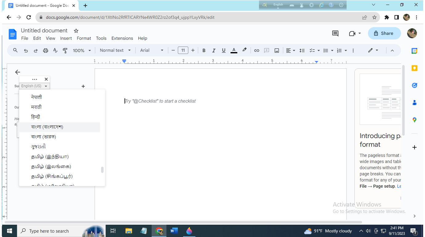 ৪. তো ভয়েস টাইপিং এ ক্লিক করার পর আপনার সামনে একটি ভয়েজ ইমেজ চলে আসবে। সেখান থেকে আপনি যে ভাষায় টাইপিং করতে চাচ্ছেন সেই ভাষাটি সিলেক্ট করতে হবে। আপনি যদি বাংলায় টাইপিং করতে চান তাহলে বাংলা সিলেক্ট করবেন এবং আপনি যদি ইংলিশ টাইপিং করতে চান তাহলে ইংলিশ সিলেক্ট করবেন। সিলেক্ট করার পর ক্লিক করবেন। তবে মনে রাখবেন ভয়েস দেওয়ার আগে অবশ্যই আপনাকে সে অপশনটিতে ক্লিক করে নিতে হবে। ক্লিক করার পর বয়েস রেকর্ড করার জন্য সেটি অন হয়ে যাবে। এবং আপনি যা লিখতে চান তা মুখে বললেই ভয়েসটি রেকর্ড হয়ে যাব। সে অনুযায়ী স্ক্রিনে লেখা উঠবে। আপনি যেটাই বলবেন সেটাই অটোমেটিক লেখা উঠে যাবে। লেখা শেষ হয়ে গেলে অপশনটিতে ক্লিক করে অপশনটি অফ করে দিতে হবে। তবে মনে রাখতে হবে একসাথে অনেক বেশি ভয়েস বলা যাবে না। আপনাকে আস্তে আস্তে অল্প অল্প ভয়েস প্রদান করতে হবে। এভাবে আপনি আসলে টাইপ করতে পারবেন। আপনি যদি ফন্ট বড় অথবা ছোট করতে চান তাহলে ফোন দিয়ে ক্লিক করে বড় অথবা ছোট করতে পারবেন। এরপর ভয়েস প্রদান করলেই আপনার নির্ধারিত ফ্রন্ট সাইড অনুযায়ী ভয়েসটি লেখা হয়ে যাবে।